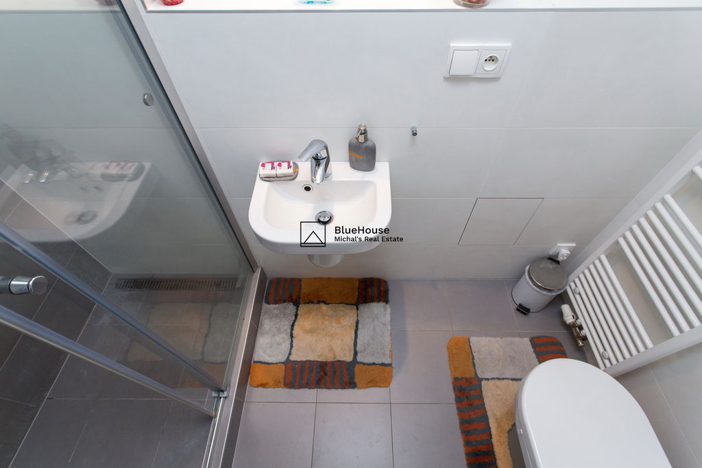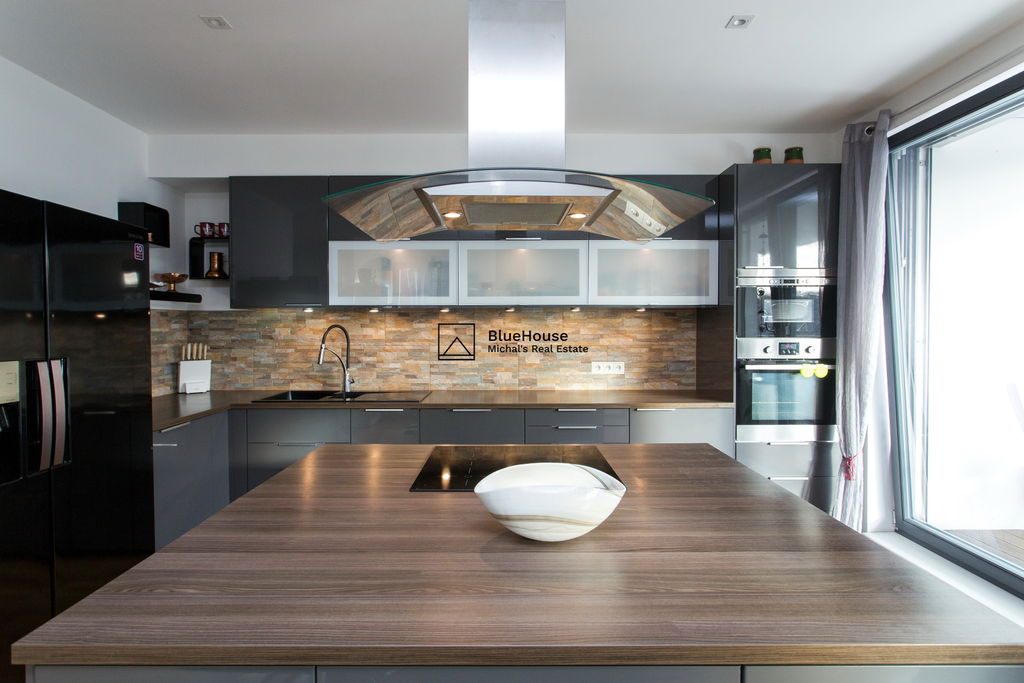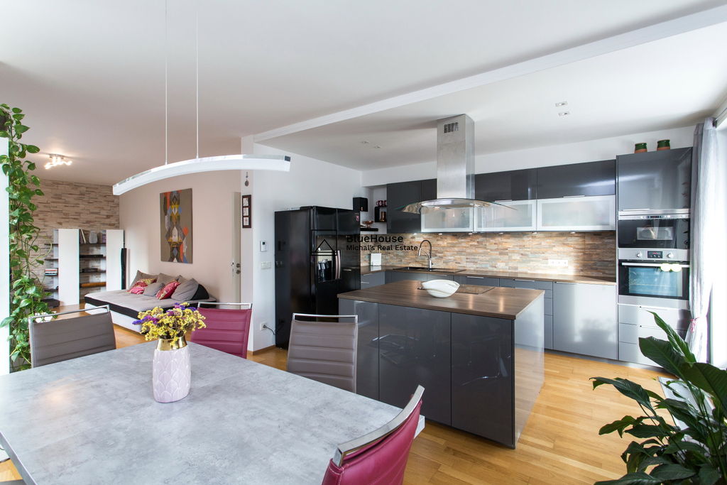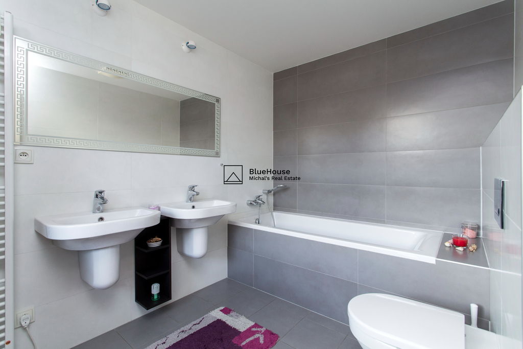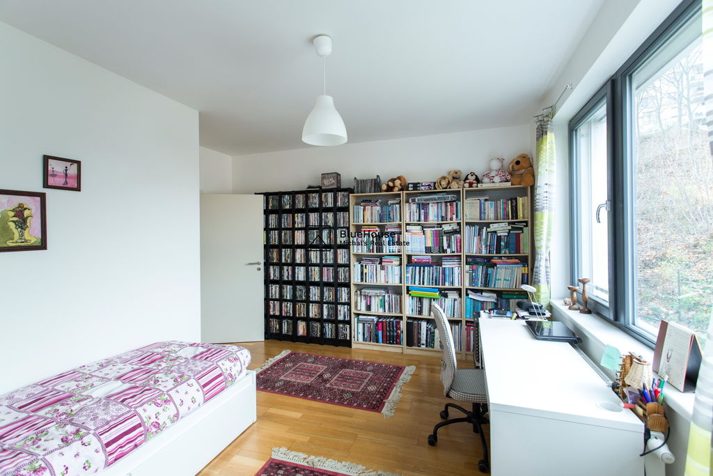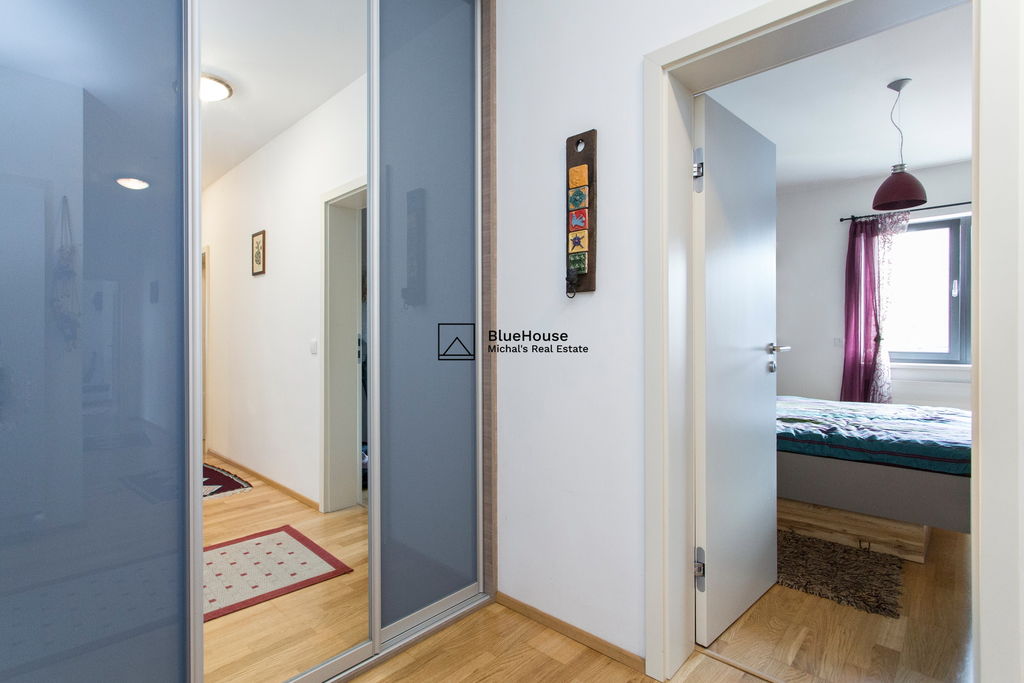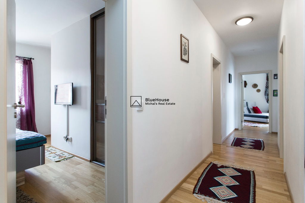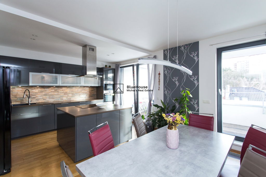 Předností toho bytu jsou zejména volné výhledy do okolí a zeleně, jižní terasa, podzemní parking, koupelna ke každé ložnici a celkový vysoký standard provedení od developera ED Group (dřevěné podlahy, venkovní elektrické rolety, zakázkové dveře, atd.).